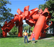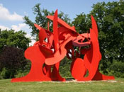 Symbol, a sculpture by Alexander Liberman, stands forty-seven feet tall with a weight of thirty tons. Its bright red color makes the symbol impossible to miss. Its abstract style adds mystery to its soft design and large scale. Top-heavy yet balanced, Symbol was designed with many loose ends in its structure. Symbol is distracting from a distance yet overwhelming up-close. Alexander Liberman, the artist of the sculpture, explained that "red is always good in a city environment. It is the only color that really breaks away from the background." Liberman was born in Kiev Russia, in 1912. He was educated in Europe and later found work as an artist in America. His work experience included editorial positions at VOGUE Magazine and Conde Nast Publications. During the 1950's, Liberman began exhibiting his own paintings and photographs at galleries in New York City. In the early 1960s, Liberman learned the basic techniques of steel welding for large scale projects that he would soon be known for. Being an immigrant, who came to America to seek work and success, Liberman was intrigued by America's industrial scale. His intrigue resulted in many sculptures that evoked the spirit of working class America. Liberman has sculptures across the country including "Illiad", in Seattle, WA and "Abracadabra", in Hamilton, OH.